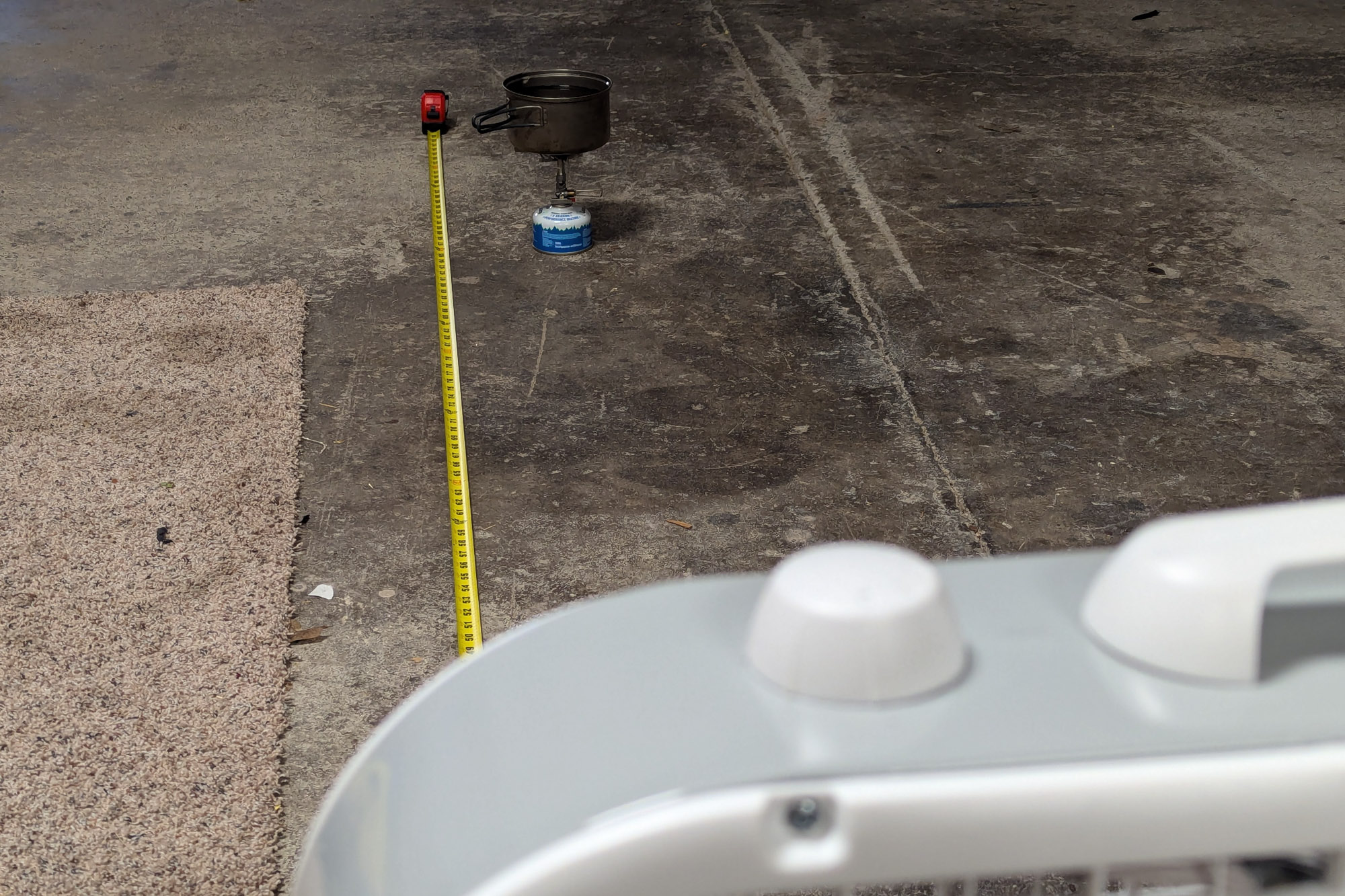 Here’s how it works: we set up a timer and thermometer, turn the stove to max output, bring a liter of cool tap water up to a boil in a lidless titanium pot, and measure the fuel container before and after. For simulating wind, we use a generic box fan set to medium and place the stove 8 feet away.